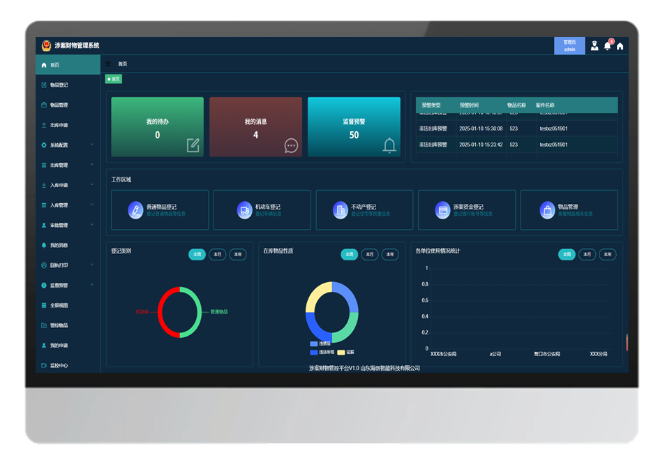 涉案财物管理系统实现对涉案财物从登记入库、出库、移交、返还、销毁等完整的管理链条进行规范管理,不留盲点;依托执法办案系统的法律手续,借助二维码、RFID标签、物联网等技术实现对涉案财物的保全、扣押、收缴/追缴、没收、销毁、返还、移交全流程可追溯,系统可 通过声讯报警进行智能提醒。