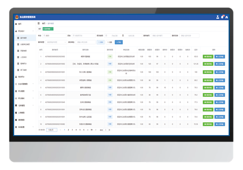 积分统计汇总统计自动化、客观性。系统自动核算民警积分、排名,最大限度减少民警工作量和人工干预,确保积分客观公正准确。民警执法清单化,每个人办理的案件及每个案件的分数、问题一目了 然。