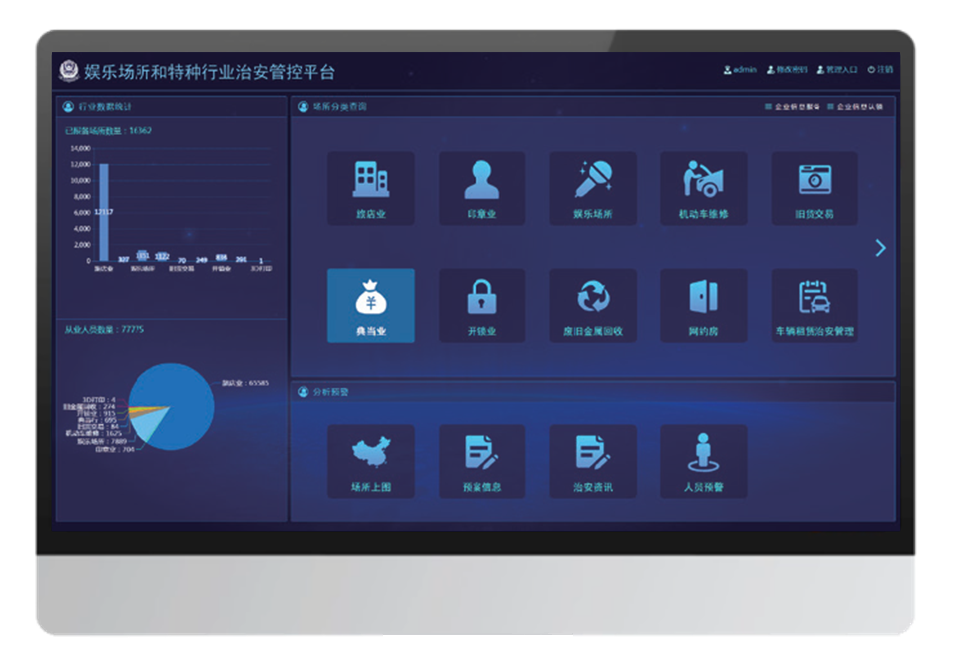 为了提升治安防控平台效能,按照“全面采集、数据整合、标准共享、管用一体、深度应用”的工作思路,以“创新驱动、科技引领、问题导向、服务实战”为抓手,研发“娱乐场所和特种行业治安管控信息系统”。平台主要由旅馆业、印章业、典当业、娱乐场所管理、开锁 业、机动车维修业、废旧金属回收业、出租房网约房、印刷业管理等九大子系统构成,全部覆盖行业场所治安管控的主要管控要素。通过对各类数据的对接整合、安全接入、安全存储,以及人工智能、大数据、云计算、人像识别、视频结构化AI分析、人像布控、轨迹分析等国际先 进技术,为各级公安机关提供智能办公、数据整合、态势感知、数据挖掘、分析研判、布控预警、监管考核等多场景实战应用。