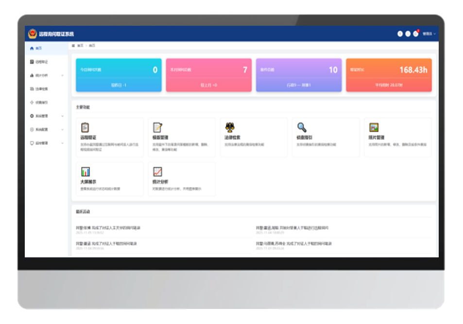 远程询问取证系统可实现人证核验、远程视频问询、全程同步录音录像、远程权利义务告知、远程辨认、远程示证、电子笔录、询问对象笔录等功能,实现跨区域、合规的询问取证,适用于基层执法办案场景。