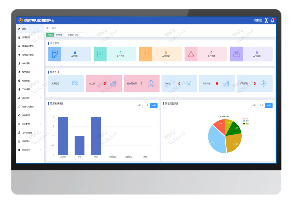 综合行政执法办案管理平台主要是为综合行政执法局提供案件受理、调查取证、审核审批、处罚决定、智慧预警、电子卷宗、统计分析等功能于一体的综合性信息化平台。平台将传统行政执法与互联网应用深入结合,实现了执法办案过程的数字化、规范化和高效化,提升执 法的质量和效率,能够实现各种类型案件全过程网上办理及流转,为办案人员提供一个完善的案件信息管理平台,让案件处理流程更简洁,执法行为更规范,执法效率更高效,实现智慧执法。
